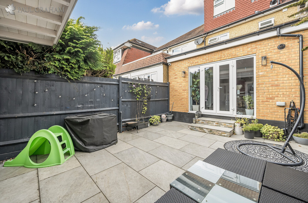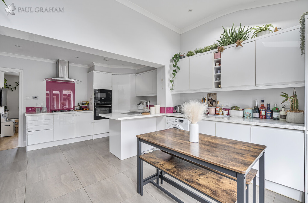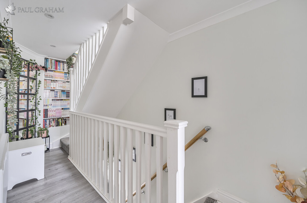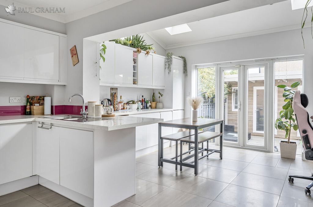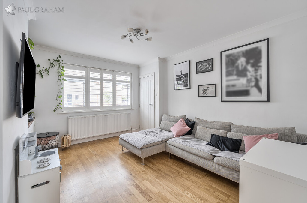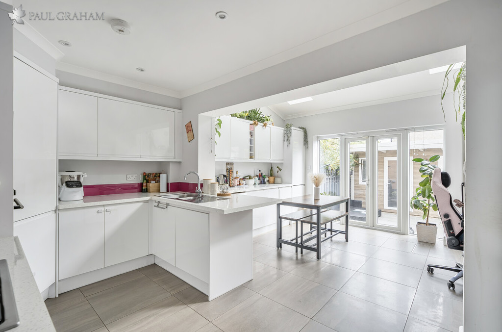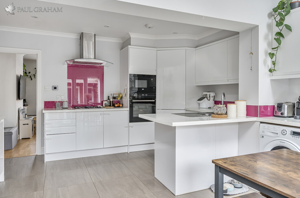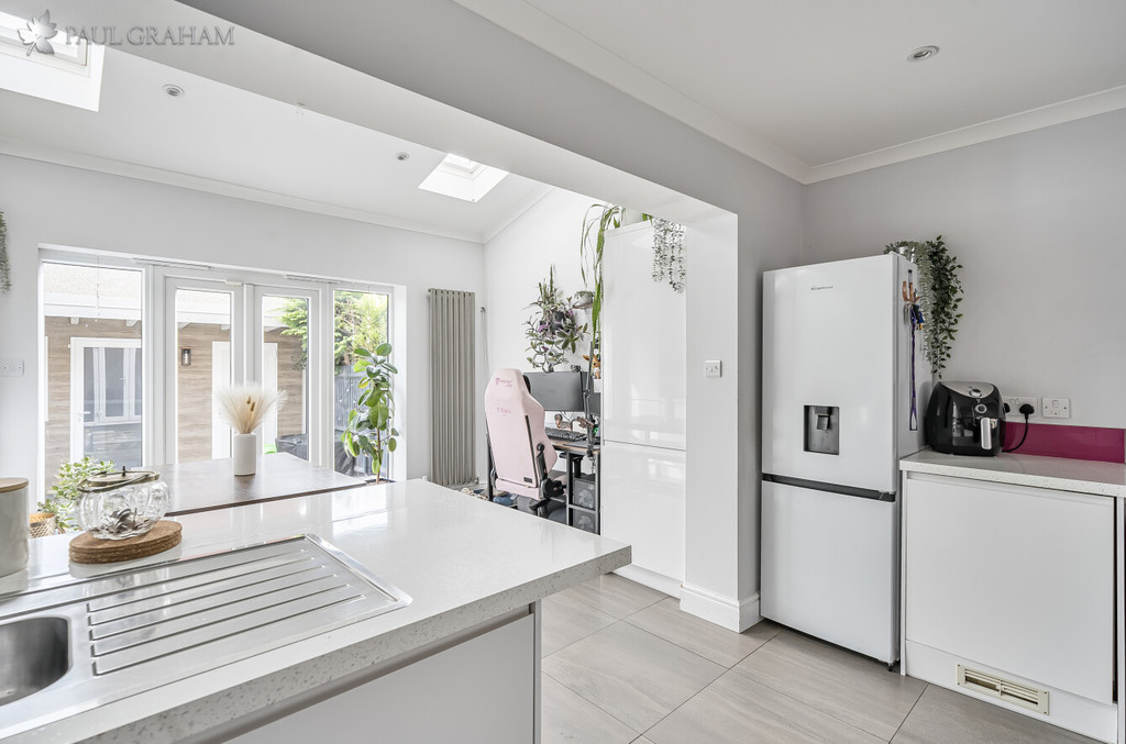 This beautifully presented three-bedroom family home has been extended to the rear and is arranged over three floors, finished to a high standard throughout. The ground floor features a welcoming lounge that flows into a bright and modern kitchen/diner, extended to the rear to create a spacious area ideal for both everyday living and entertaining. French doors open onto a south-facing garden, seamlessly connecting indoor and outdoor spaces, while a cleverly concealed under-stairs storage cupboard adds a practical touch.