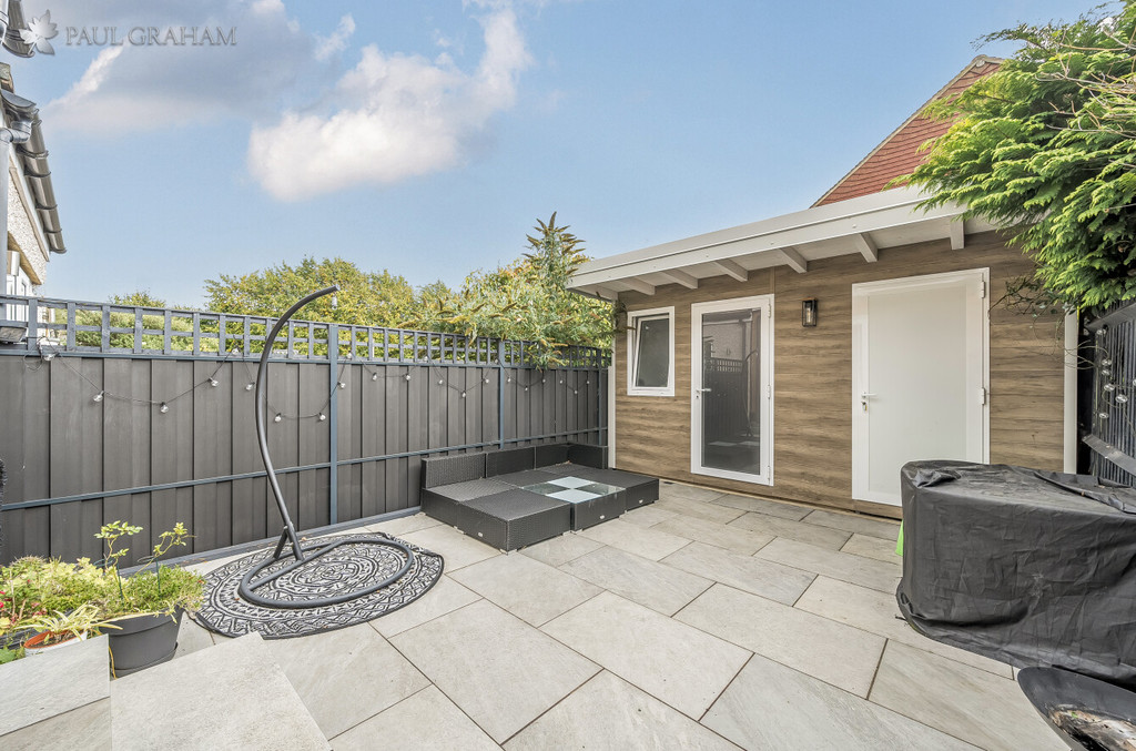 Upstairs, the first floor offers two well-proportioned bedrooms and a stylish family bathroom. The top floor is home to an impressive principal bedroom complete with fitted wardrobes and a sleek en-suite. All bedrooms include built-in storage, and the property also benefits from a versatile garden outbuilding, perfect for use as a home office, gym or creative space. Off-street parking and a smart security system with CCTV and a burglar alarm provide added peace of mind.