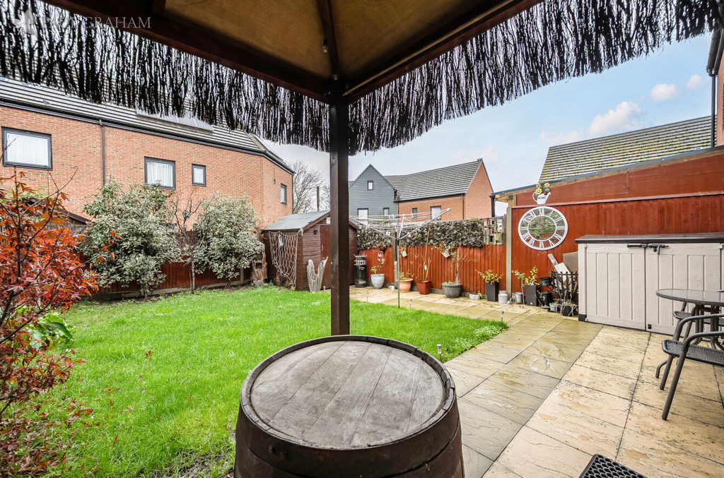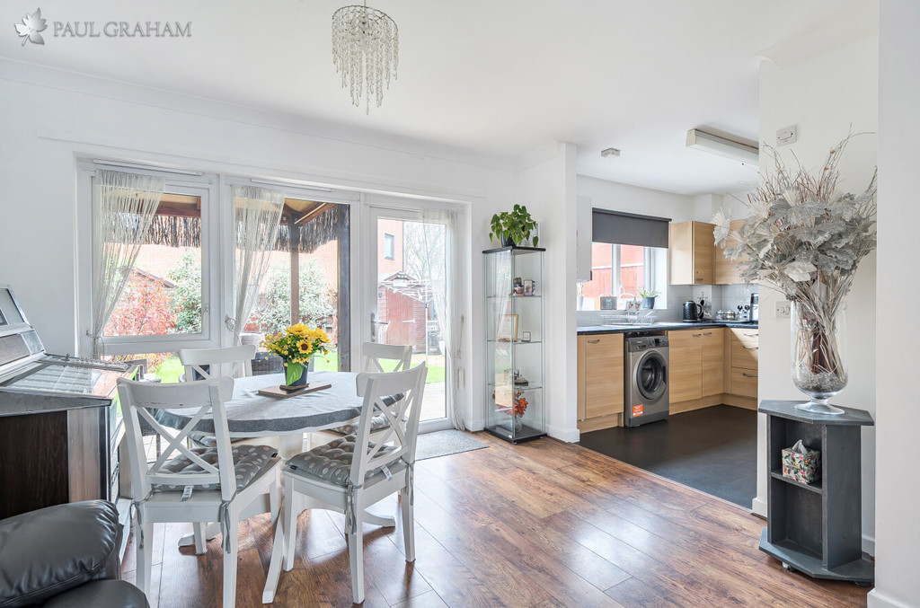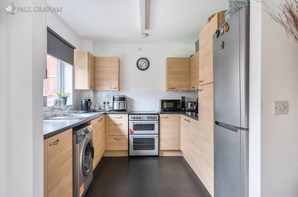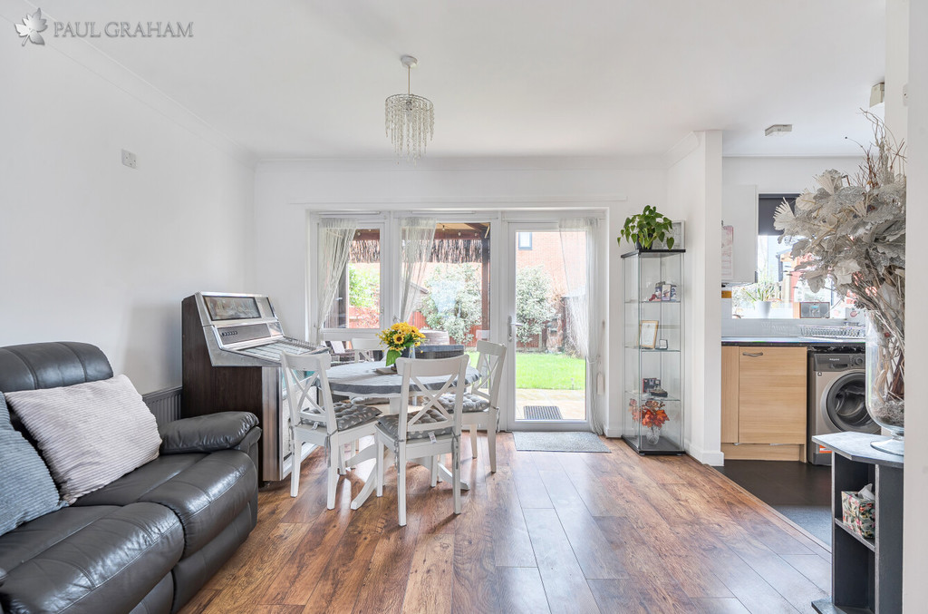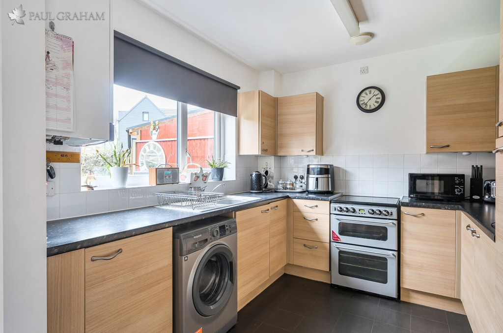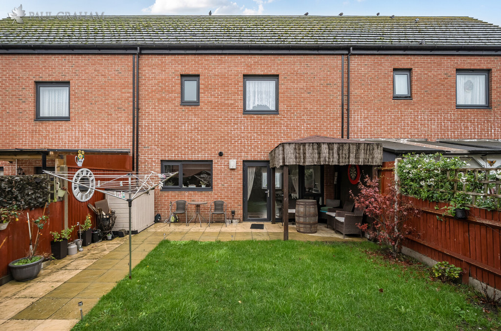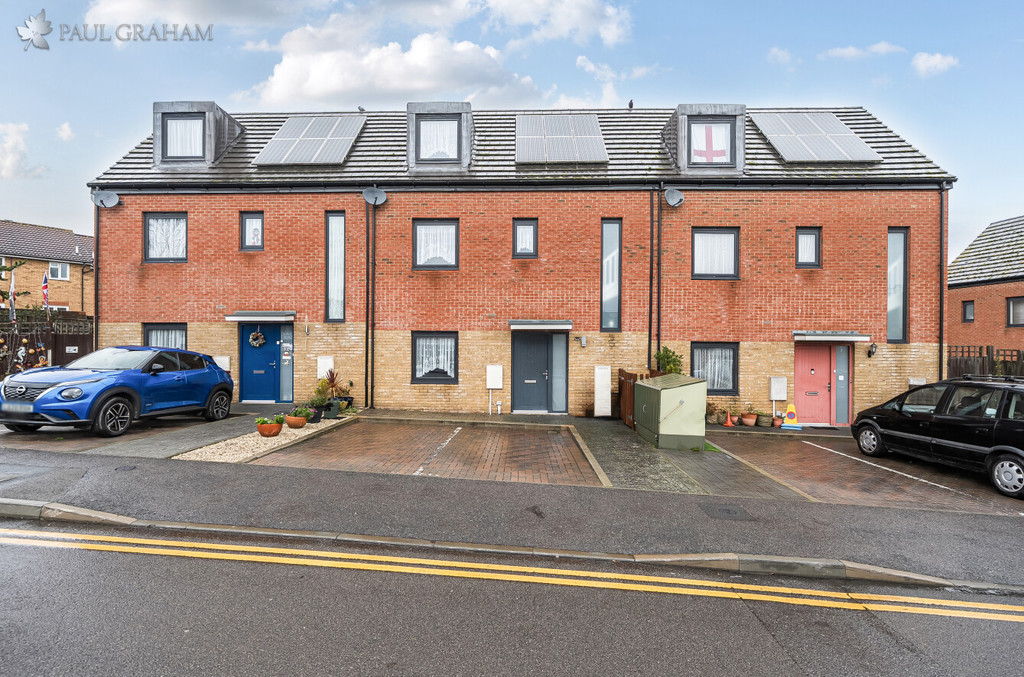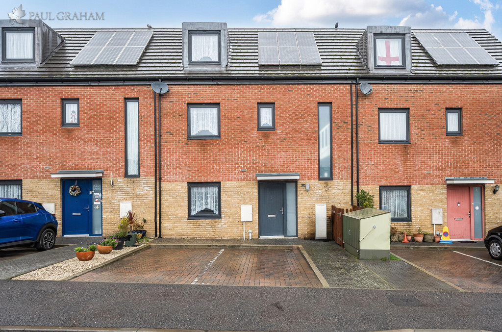 Set within a popular modern development, this well-presented three-bedroom home offers generous accommodation arranged over three floors. The ground floor features a bright open-plan kitchen/reception room, perfect for family living and entertaining, along with a convenient WC. The property has been well maintained throughout and includes valuable additions such as solar panels, ensuring improved energy efficiency. All three bedrooms are genuine doubles. Outside, the private landscaped garden provides an inviting space to relax, while the front of the house offers off-street parking for two cars.