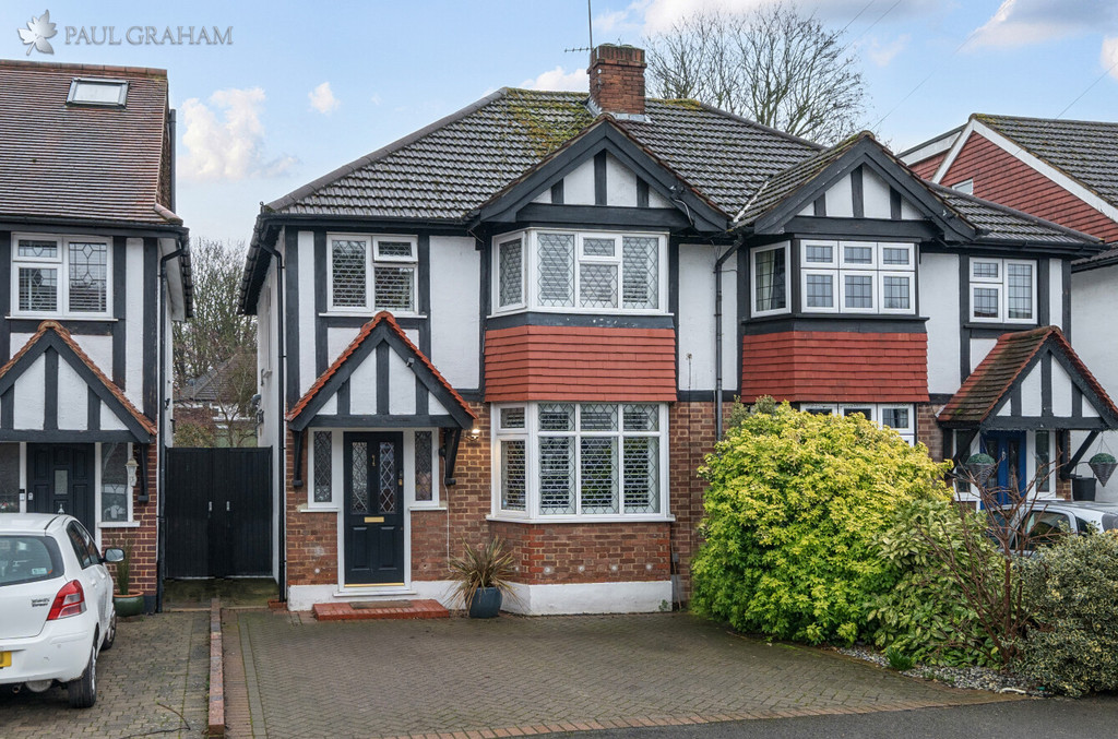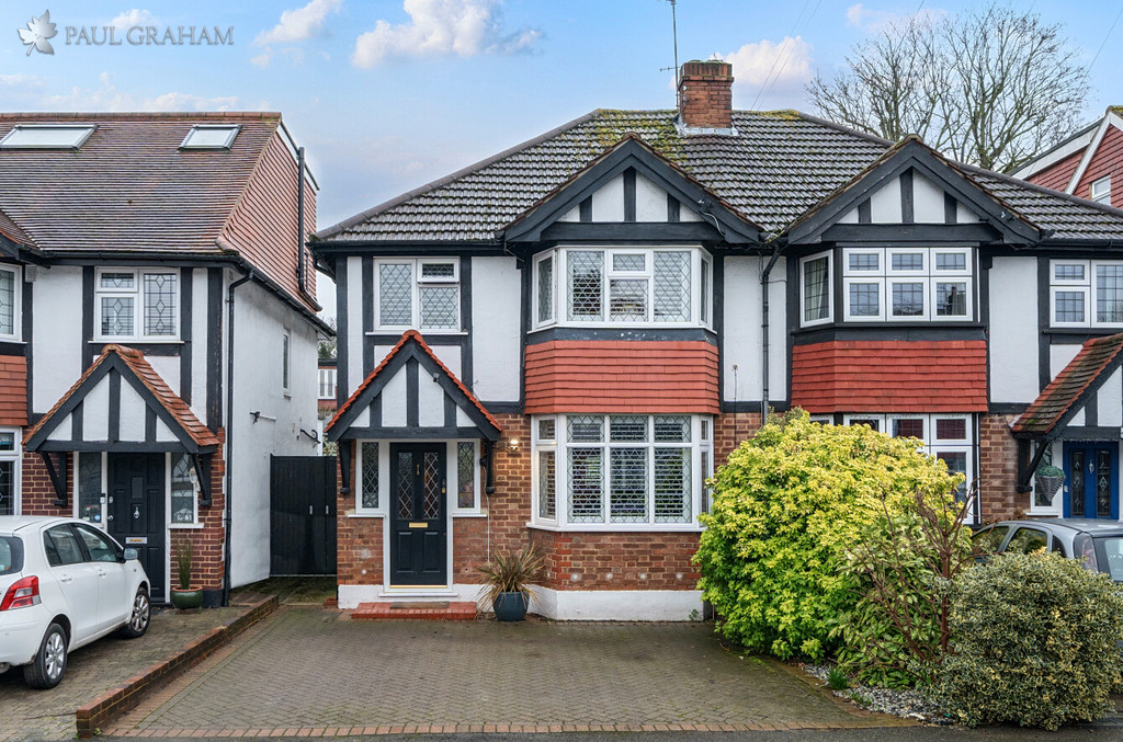 Guide Price £600,000 - £625,000. This charming three-bedroom semi-detached home showcases an attractive mock Tudor-style façade and is presented in excellent condition throughout. Internally, the property offers a bright and spacious living room featuring beautiful parquet flooring, a well-maintained kitchen and a sleek, modern family bathroom, all arranged in a practical and family-friendly layout.